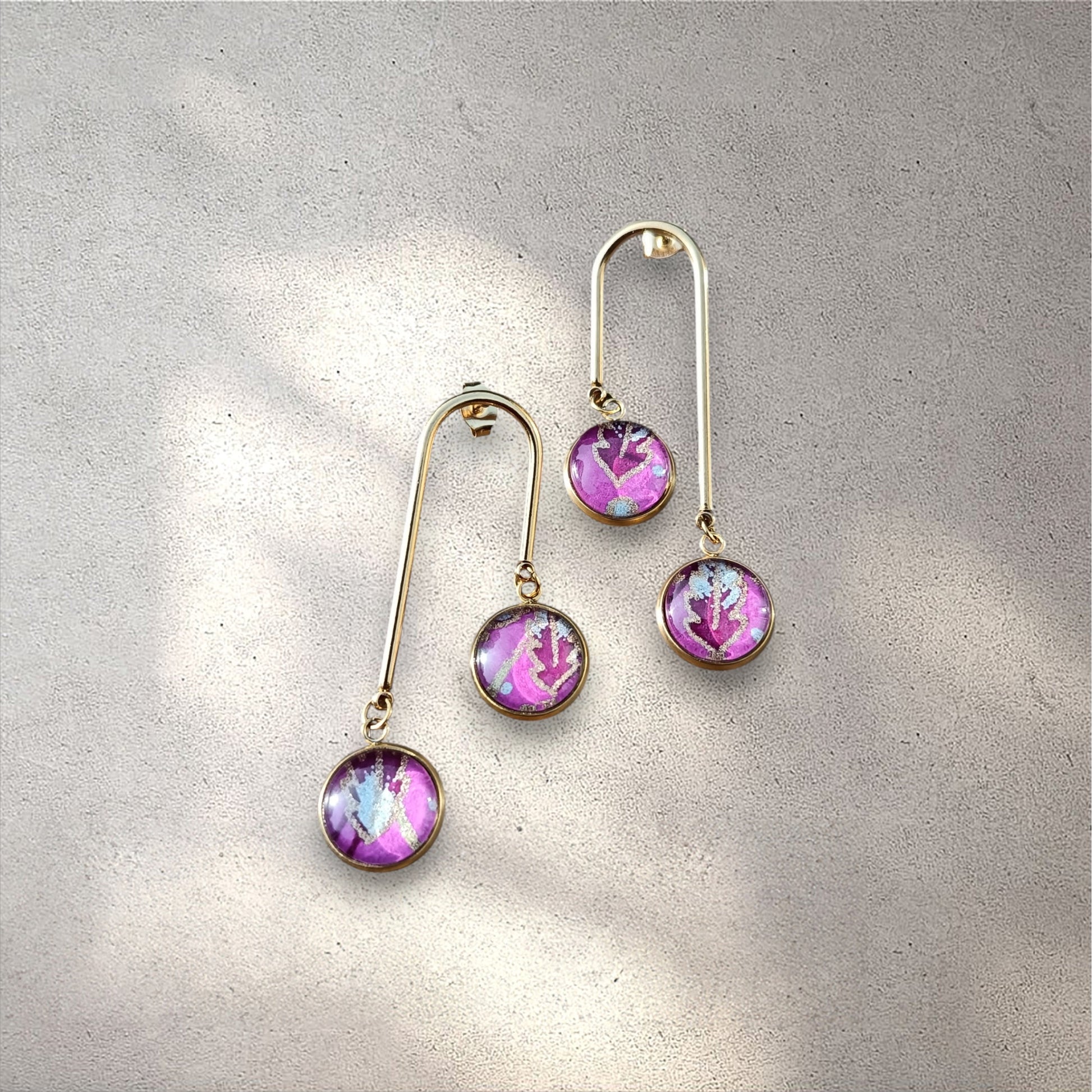 Parure de boucles d'oreilles pour oreilles percées en acier inoxydable doré, avec pampilles en papier washi et cabochons en verre.