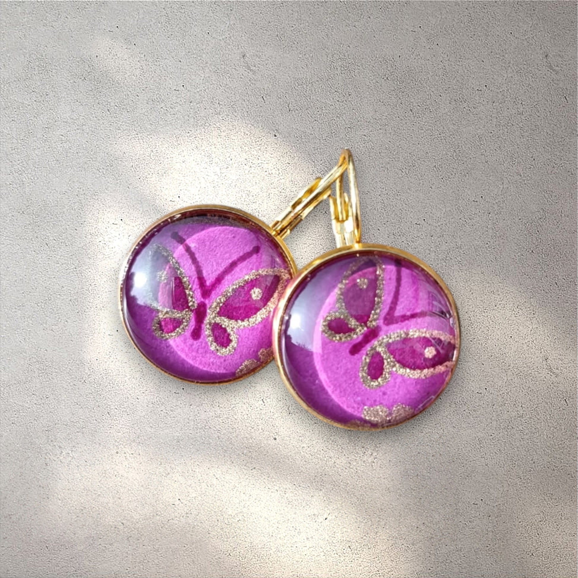 Paire boucles d'oreilles dormeuses, en acier inoxydable, ornée de papier washi et d'un cabochon en verre.