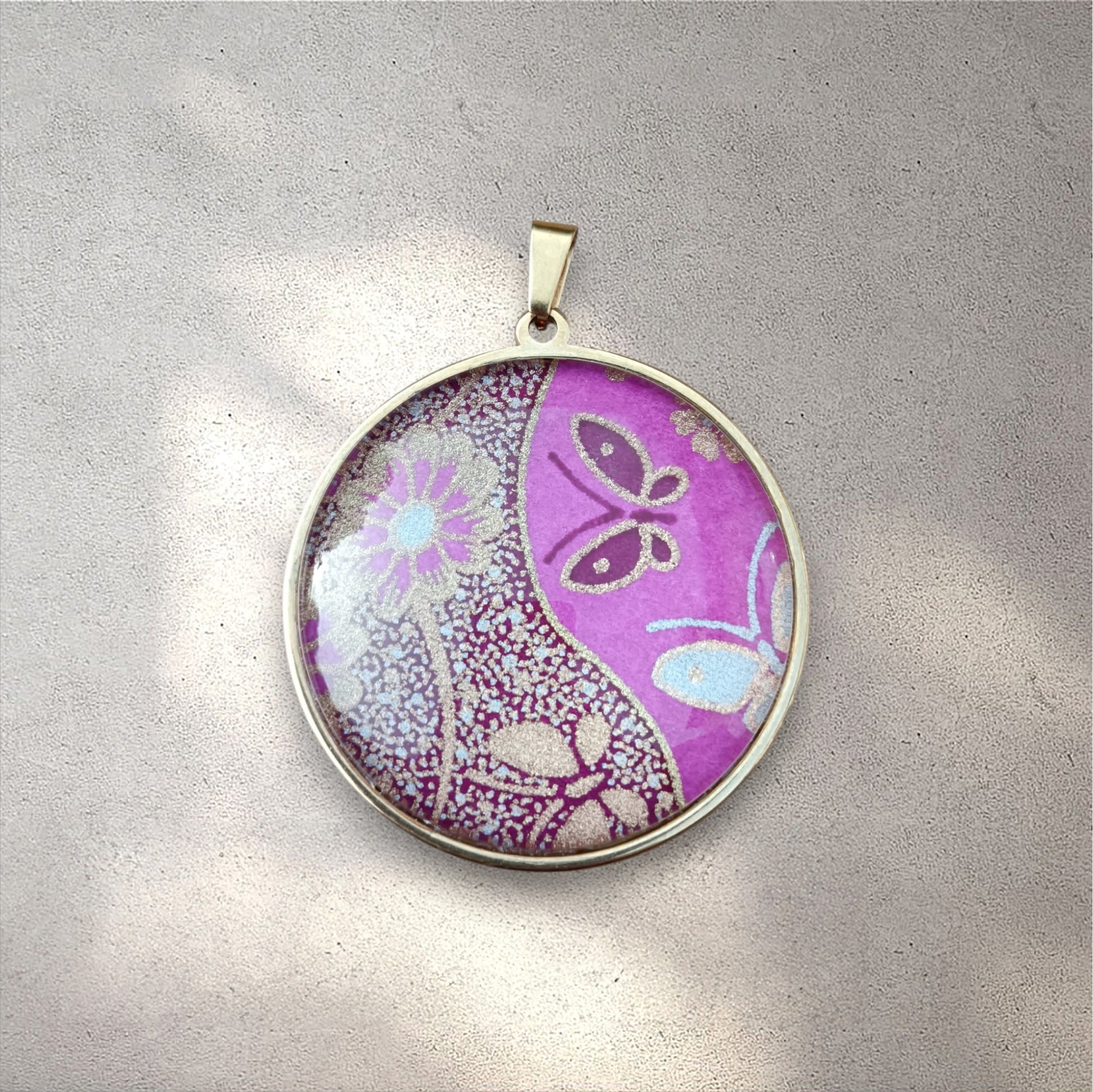 Médaillon en acier inoxydable doré, décoré de papier chiyogami recouvert d'un cabochon en verre.